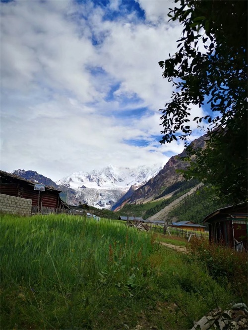 米堆冰川主峰海拔6800米,雪线海拔只有4600米。这是一处纯洁却不单调的美景之地。古朴的藏族村落、牛羊马儿漫步草地上悠闲食草,周围高山上森林、草地与其作伴,让高冷的冰川变得有些平易近人。