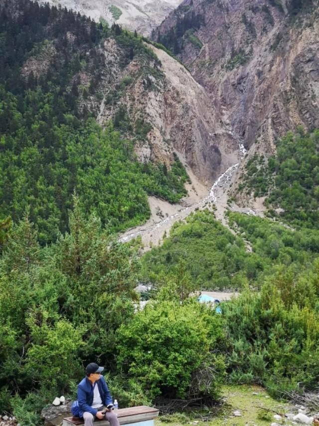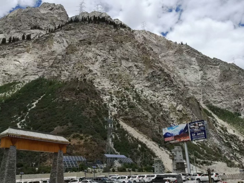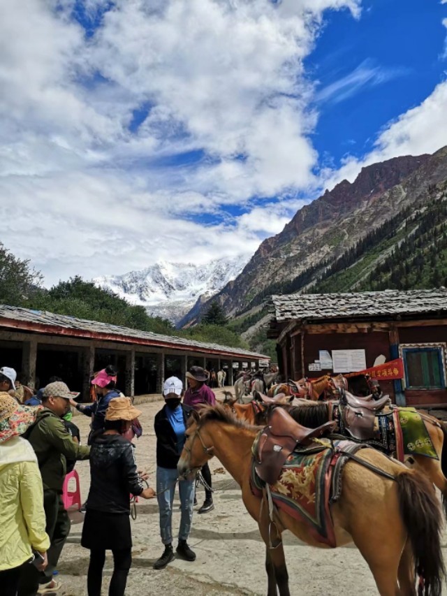米堆冰川就在318国道边上,门口有很大的停车场。我们买票后坐上景区的区间车到达米堆村,然后步行2公里才能到观景台远观冰川。也可以骑马上去。