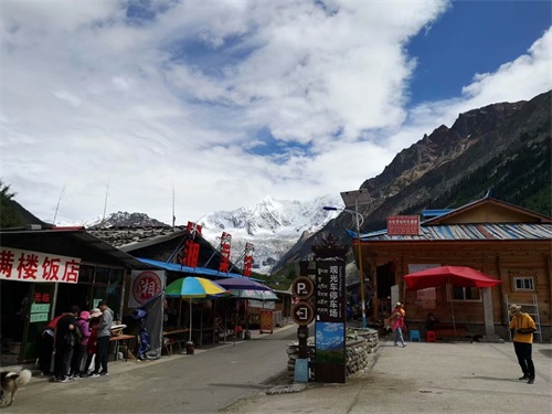 米堆冰川脚下就是一个叫米堆的藏族村子。村子里街道两边都是商铺,有羊肉串、牛肉串、奶茶,还有藏区饰品等。
