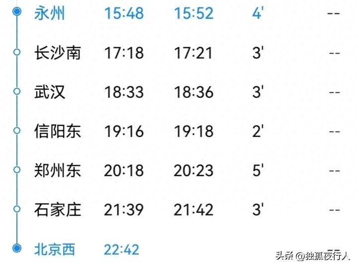 G94南宁东至北京西,15点48分到达永州站,15点52分开车,中间经停长沙南、武汉、信阳东、郑州东、石家庄5站,晚上22点42分到达终点站北京西站。