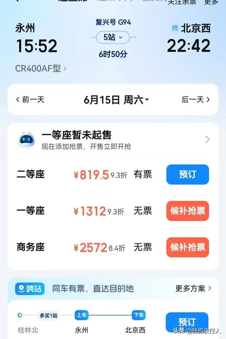 6月15号调图涨价之后,G94永州至北京西的票价:二等座819、一等座1312、商务座2572。永州至长沙南的票价:二等座130、一等座211、商务座407.