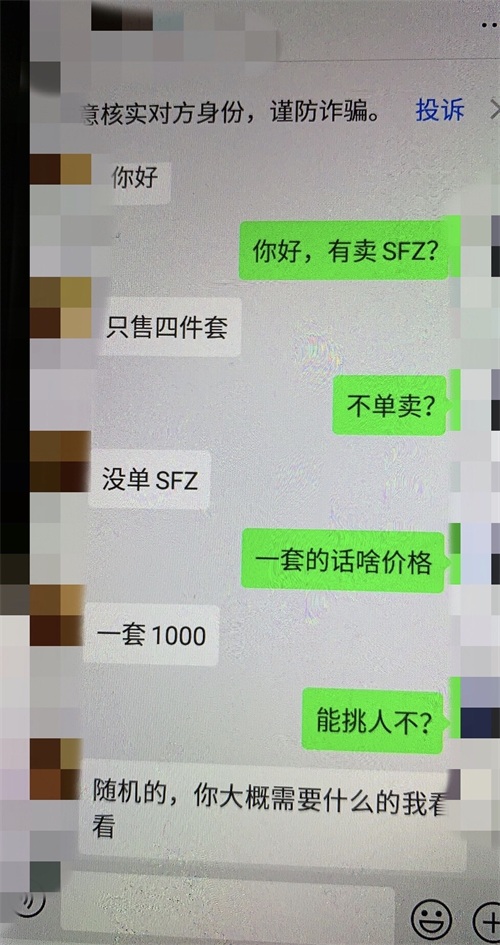另一名卖家也对新京报记者称,一张身份证500元,真实有效。甚至还有卖家告诉新京报记者,不单独销售身份证,只售四件套,一套1000元,而四件套包括手机号、银行卡、U盾和身份证。