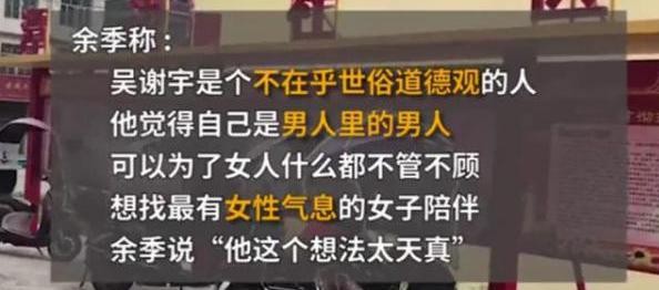 余季称,吴谢宇是个不在乎世俗道德观的人,他觉得自己是男人里的男人,可以为了女人什么都不管不顾,想要找最有女性气息的女子陪伴。余季说“他这个想法太天真”。
