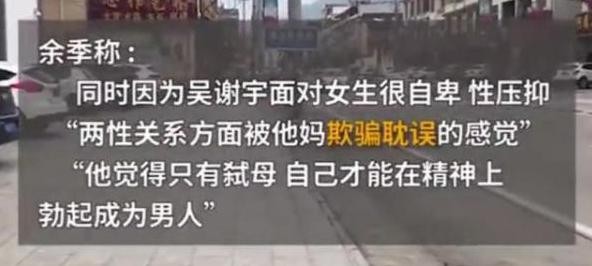 余季称,同时因为吴谢宇面对女生很自卑,性压抑,“两性关系被他妈欺骗耽误的感觉”“他觉得只有弑母,自己才能在精神上勃起成为男人。”吴谢宇觉得自己是男人,不应该为母亲的想法而活着。