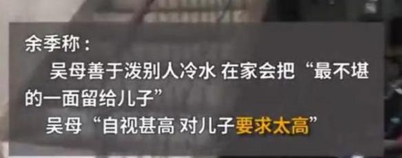 余季称吴谢宇弑母动机系心理遭母亲压抑太久。吴母是传统女性,同时又是中学老师,她希望儿子读书的目的是赚钱,毕业之后照顾,赡养自己。吴母自视甚高,对儿子要求太高,善于泼别人冷水,在家里会把“最不堪的一面留给儿子”