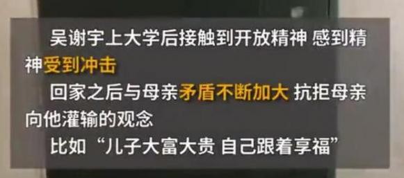 吴谢宇上大学后接触到开放精神,感觉精神受到冲击,回家后与母亲矛盾不断加大,抗拒母亲给他灌输“儿子大富大贵,自己跟着享福”的想法。