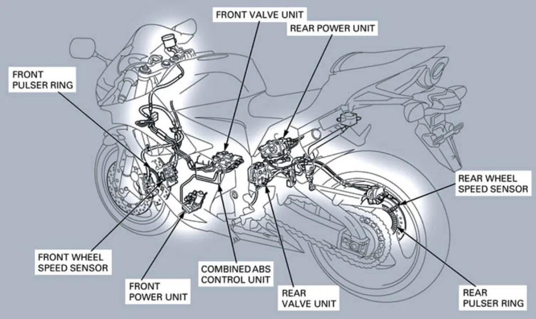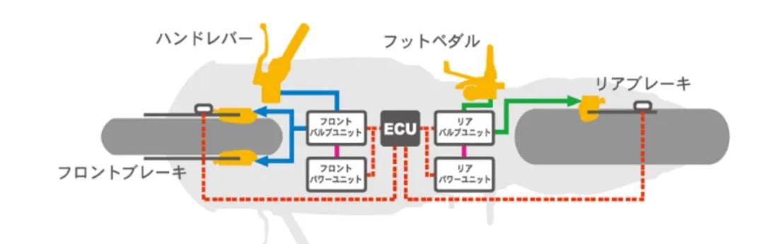 "Combined ABS"整个制动过程是这个样子的:握住制动杆→制动液向ECU侧施加压力→ECU检测并计算压力值,通过自身控制回路驱动电机,推动活塞→活塞将制动片压向制动盘→从而实现减速制动。