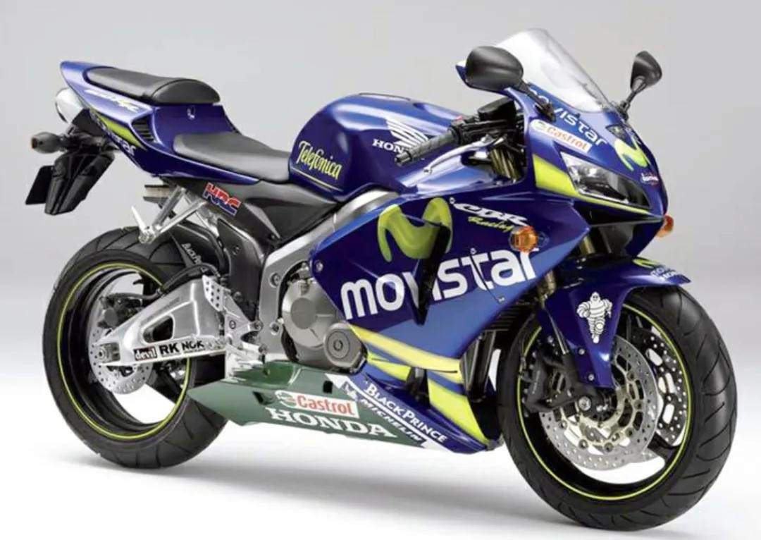 CBR600RR这个贴花配色看上去是不是特别的不真实?是不是感觉特别的出戏?其实这款配色是真实存在的,这是2006年本田推出的纪念版的Movistar配色方案。