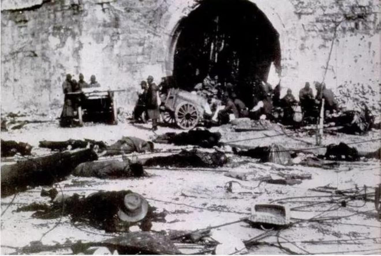 日本士兵推着车装满了洗劫的赃物,旁边是死去的中国人民的尸体