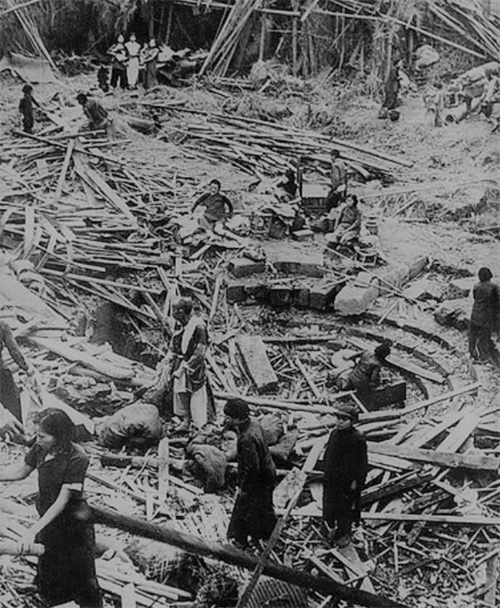 1942年,日军对重庆进行了轰炸行动,导致房屋被毁的百姓们站在废墟中。此后长达6年的时间里,日军对重庆及其周边地区进行了约200次的空袭