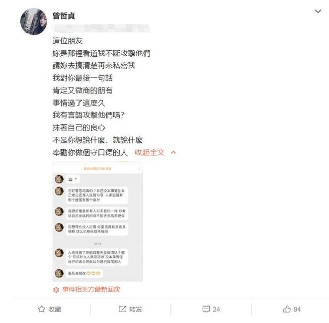 这次在网络上发私信大肆谩骂的网友,曾哲贞猜测正是其卖化妆品的朋友。在曝光的截图中,这位网友对曾哲贞人身攻击,甚至恶意中伤让其去死。