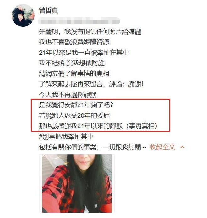 文字间满是恶毒,这让什么都没做的曾哲贞感到委屈和恼火。其实早在去年5月时,曾哲贞就发文澄清自己不想和前夫再有任何联系。