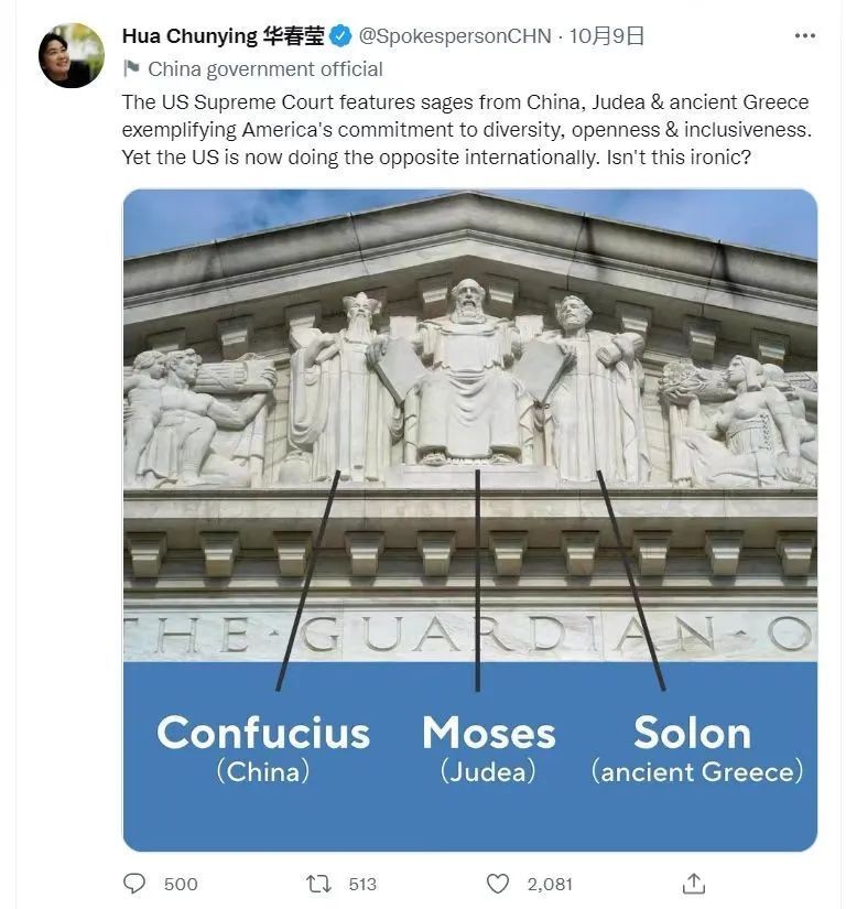 10月9日晚,中国外交部部长助理华春莹在社交媒体推特上发文,以美国最高法院的门楣雕塑设计为例,指出如今的美国已经背弃了其宣扬的多元、开放、包容理念。