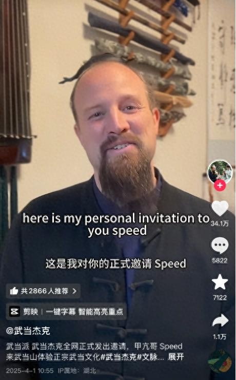 4月1日,武当三丰派外国弟子杰克在官方账号上正式发布视频邀请“甲亢哥”speed前来武当山体验正宗武当文化。杰克道长在视频中表示:“如果你真的想了解中国,你必须参观这座山,我甚至可以当你的翻译,我会带你去爬山、练习武术、学一点太极拳,也可以体验中国的传统文化,欢迎您来武当山。”