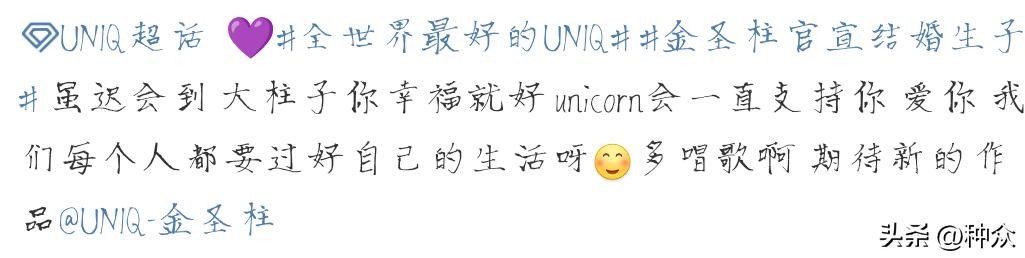 3月2日,@UNIQ-金圣柱 发微博官宣结婚生子,他表示选择站出来公开家庭状况,不仅是为了结束所有的猜想,更是想与大家一起分享幸福。“我再次向每一位因我的决定而感到惊讶或失望的朋友说声抱歉,并衷心感谢你们一直以来的理解与支持。”