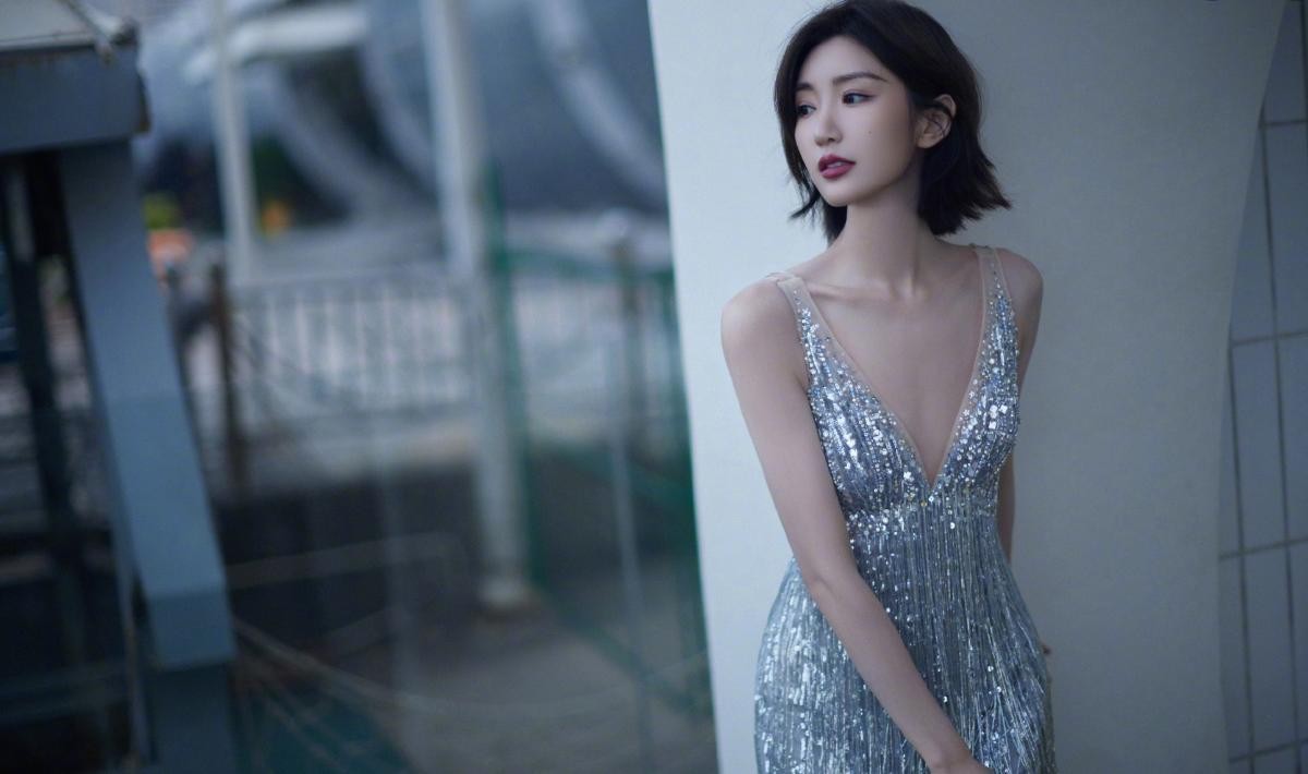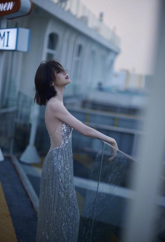 银色流苏长裙,深V风格,展现出火辣的身材,远近虚实结合,很有意境。干练的中短发,散发着迷人的气息。