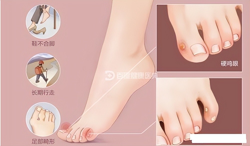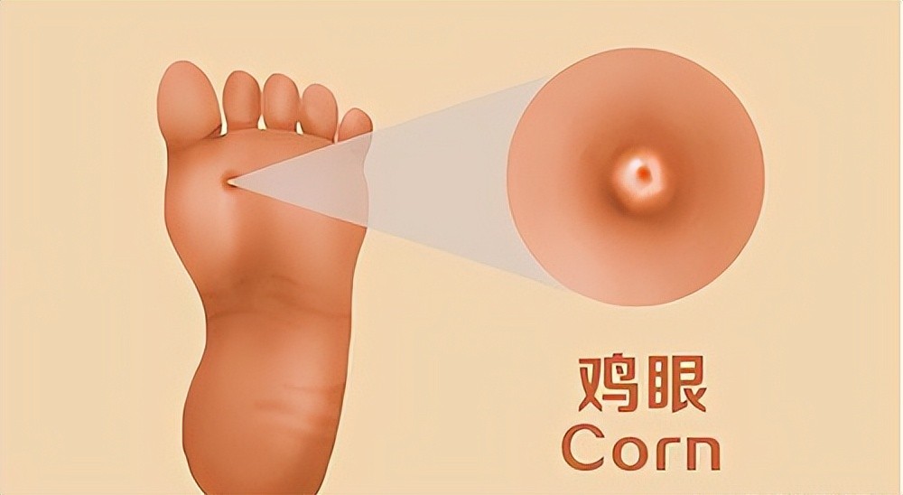 鸡眼:鸡眼多是长在受到摩擦的部位,比如说地方足趾背面、小趾外侧、足底、趾间等处。