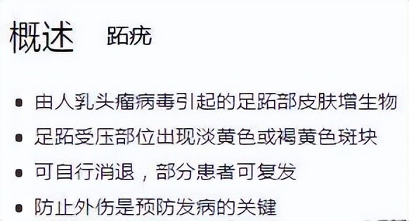 跖疣:跖疣是由人类乳多空病毒(主要为HPV)感染引起,多发生于足底部的寻常疣,是一种传染性疾病。
