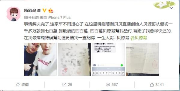 最后在贝源哥(快手的一个富豪)调解下,高迪赔偿400万了事!之后高迪恢复了自由身!