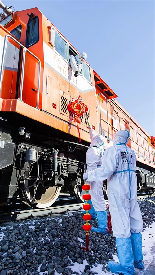 (在内蒙古锡林郭勒的出入境边防检查站,民警将春节装饰送上中欧班列,图片源自@人民视觉)