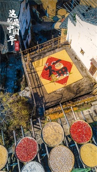 摄影内容 / 2021年2月2日,婺源篁岭古村以丰收的五谷拼出长宽4.5米的“福”字,送上新年祝愿