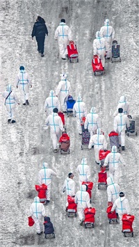(2021年春节期间,政府组织志愿者为疫情隔离住户发放蔬菜,摄影师@任兴东)