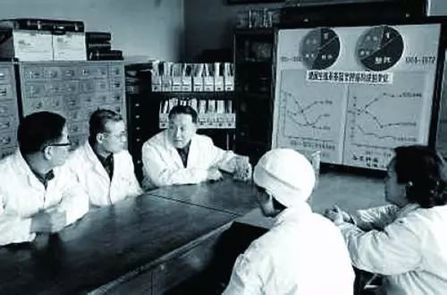 吴阶平(左三)在北京医学院第一附属医院新门诊部和医生们研究肾结石治疗问题。