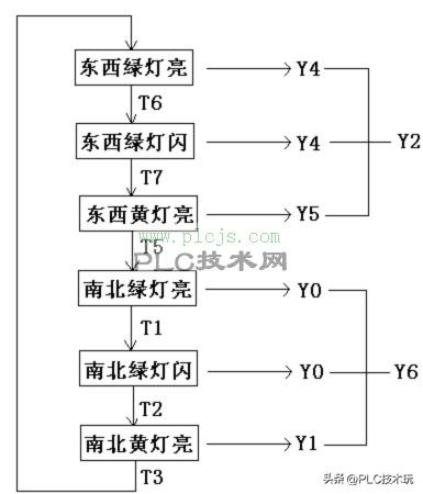 (5)上面说的南北、东西信号灯这样反反复复交替工作的情况,指挥着十字路口的交通,它的先后顺序像下面这样。