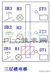 下面展示的就是三层楼电梯的示意图。电梯上升和下降是靠一台电动机控制的,电动机正转电梯就上升,反转电梯就下降。每层都设置了一个呼叫开关(SB1、SB2、SB3),还有一个呼叫指示灯(H1、H2、H3),再有一个到位行程开关(ST1、ST2、ST3)。