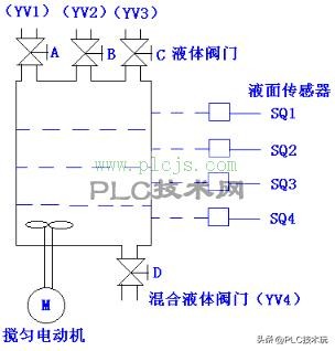 多种液体自动混合装置的 PLC 控制 就像图里展示的这样,这是个三种液体混合的装置,SQ1、SQ2、SQ3 和 SQ4 是液面传感器,液面把它们淹没的时候就接通了。液体 A、B、C 还有混合液的阀门是由电磁阀 YV1、YV2、YV3、YV4 来控制的,M 是用来搅匀的电动机,它的控制要求是这样的:
