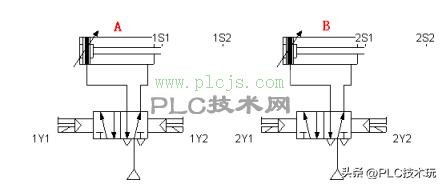 设计程序,使两个气缸顺序动作,其顺序为:A1B1B0A0。