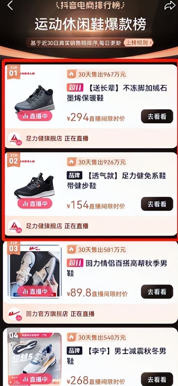 甚至足力健这样的老年鞋,都能在某音电商排行榜上面排名前二。