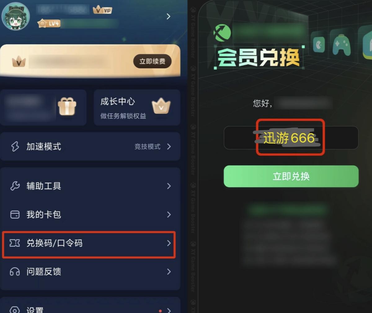 最后,我们在个人中心口令兑换位置输入白嫖口令【迅游666】,还可以兑换到白嫖加速时长哦,不仅可以加速获取逆水寒手游,还可以获取其他全球热门手游哦。