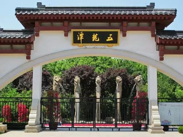 五龙潭公园因园内主要景观为五龙潭而命名,又称"净池"。旧有传说五龙潭为隋唐英雄秦琼宅邸,后因暴雨陷落下沉成为今日的五龙潭。