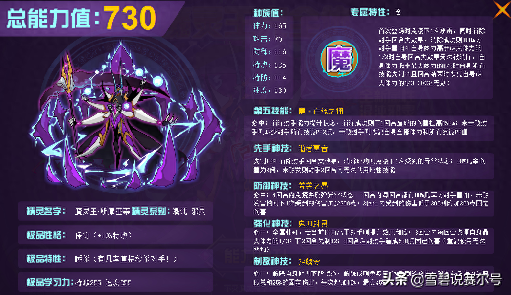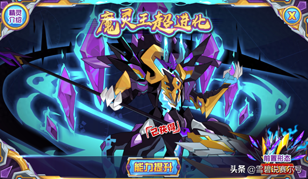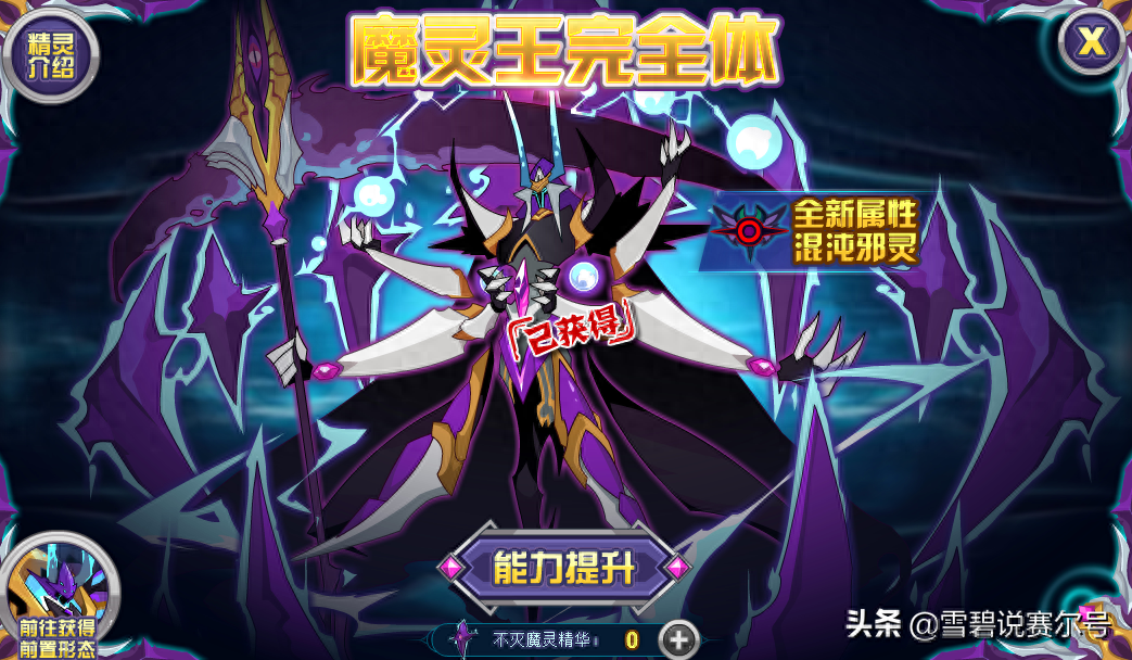 属性也是为了表示和布莱克是同族采用的暗影系,机制完全没有魔界那么强力,基本也就一个属性概率害怕能入眼。入手方式上,参加14年活动魔灵王的激变,通过3个关卡即可将小形态进阶,总体难度当年还不算太阴间,算是较为平民的一个精灵了,可惜强度也是够呛。
