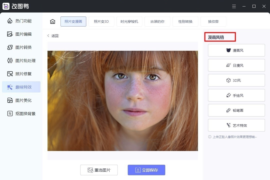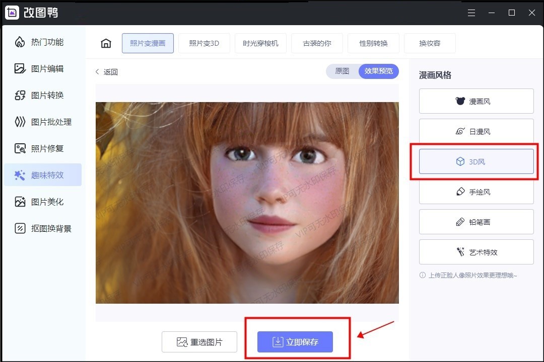 ④再试试【3D风】,转换之后的图片就像是动漫里面的任务一样,整体看来还是不错的。其他风格大家可以自己上传照片尝试一下。点击【立即保存】,这张有真人照片转漫画风的图片就保存在我们的电脑里啦。