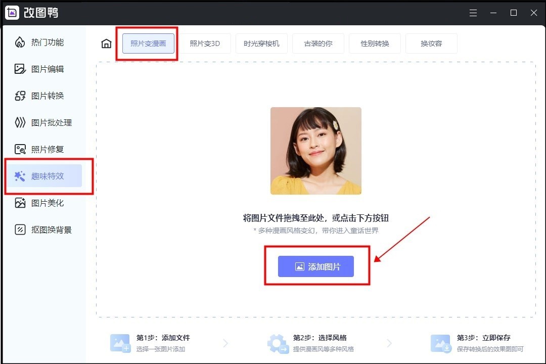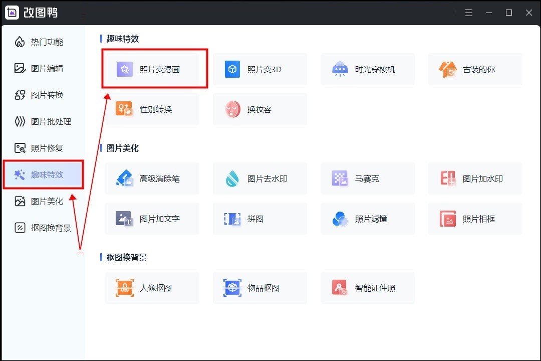 ①首先,我们在电脑上打开今天用到的工具改图鸭,点击来到首页位置,页面左侧是一列工具分类,页面右侧是具体的工具操作入口。我们在左侧点击第六个工具【趣味特效】,可以看到这个分类里面有5个不同的具体工具,点击第一个【照片变漫画】。