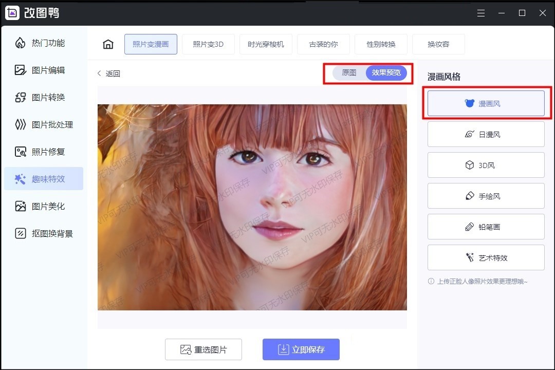 六种漫画风格都可以点击看看效果,这里我们点击【漫画风】,稍微等待一下漫画风的图片就出来了,可以点击原图和效果图对比。