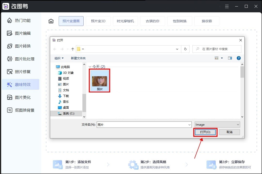 ②进入照片变漫画页面之后,点击【添加照片】,从电脑文件中选择一张人像图片上传(建议最好是正脸比较清晰的图片,在转换成漫画之后效果会更好)。