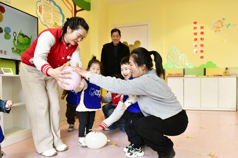 2月20日,在日照市东港区知子树托幼园,老师和家长在陪伴孩子做亲子游戏。