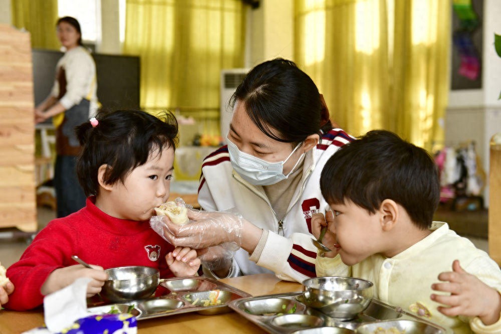 2月20日,在日照市市直机关幼儿园,老师在照顾孩子用餐。