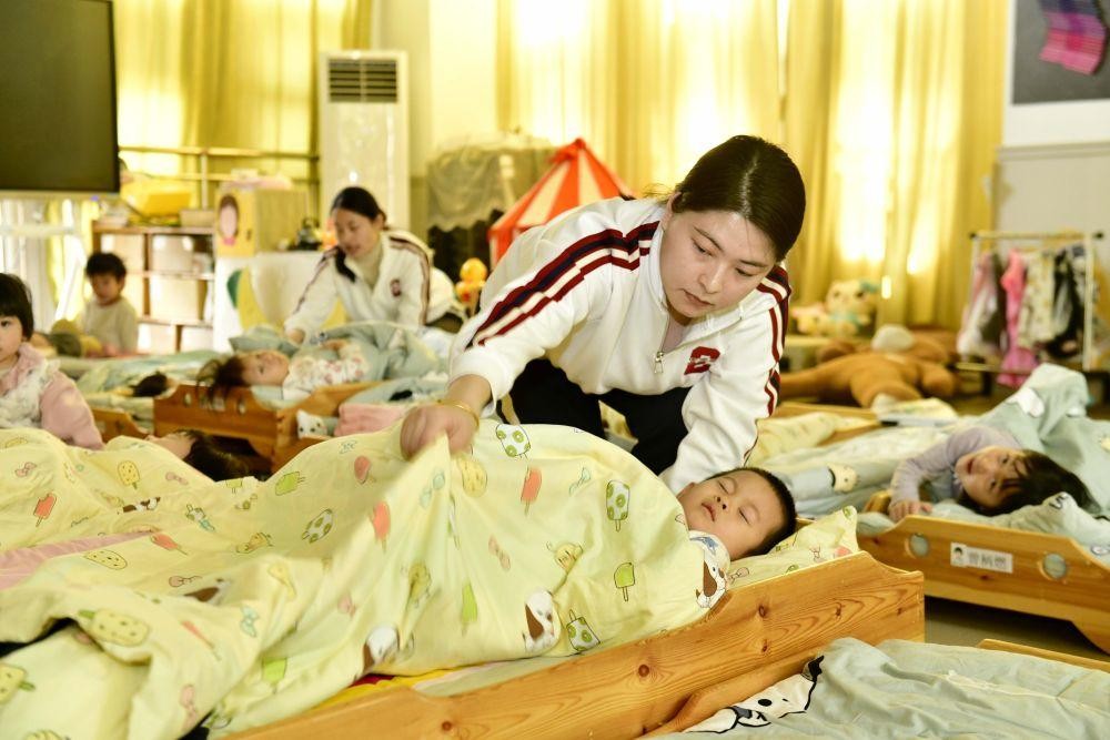 2月20日,在日照市市直机关幼儿园,老师在照顾孩子午休。