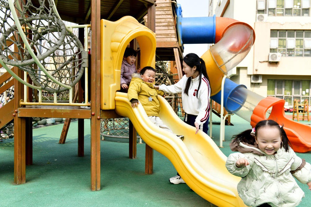 2月20日,在日照市市直机关幼儿园,老师在陪伴孩子滑滑梯。