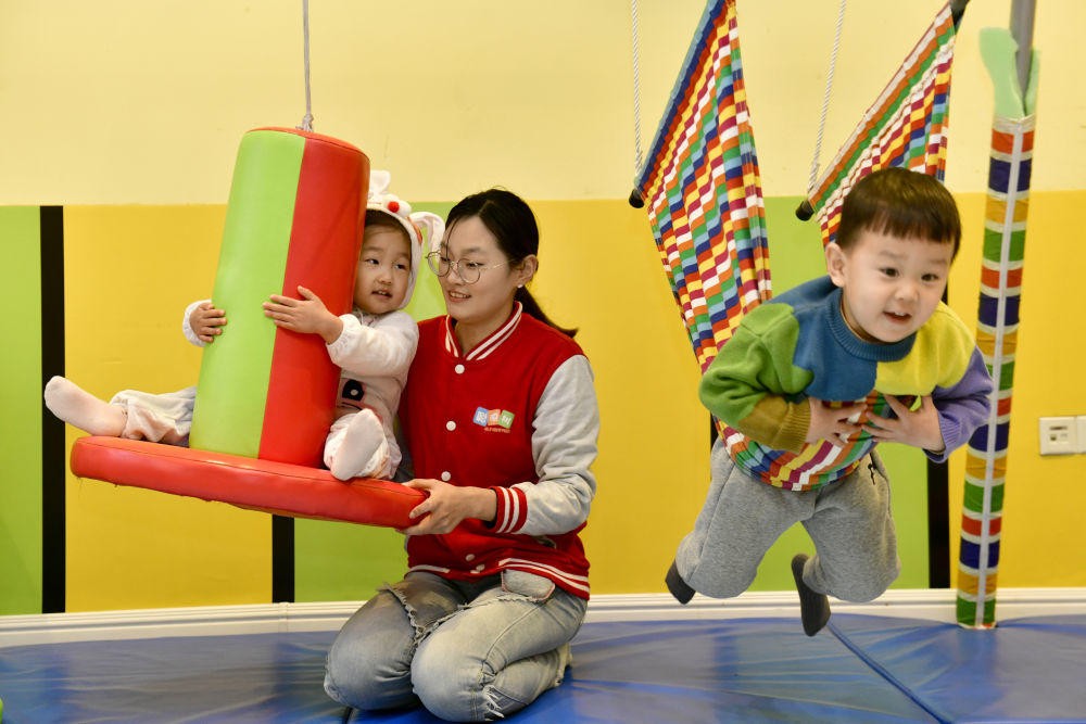 2月20日,在日照市东港区知子树托幼园,老师陪伴孩子做感统训练。
