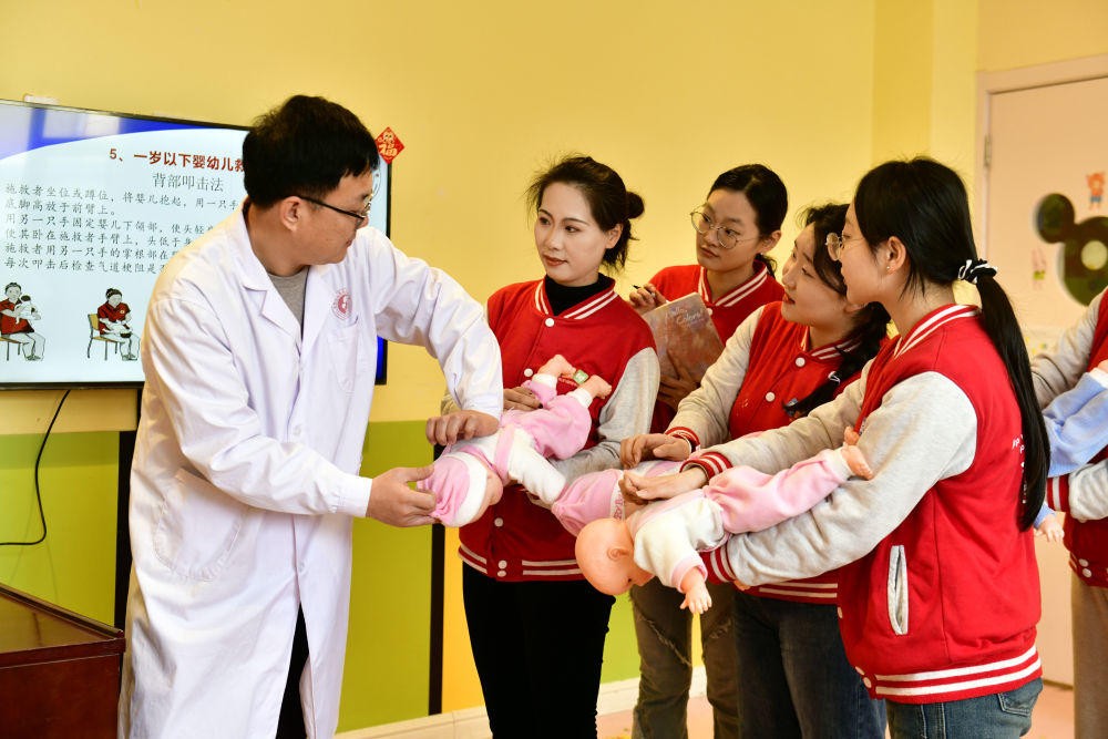 2月20日,在日照市东港区知子树托幼园,东港区妇幼保健院的医生教托幼园老师婴幼儿护理知识。