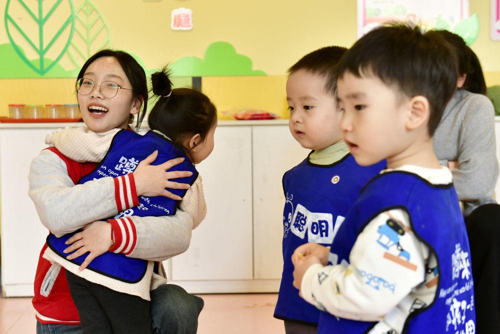 2月20日,在日照市东港区知子树托幼园,亲子游戏过程中老师给孩子一个拥抱鼓励。