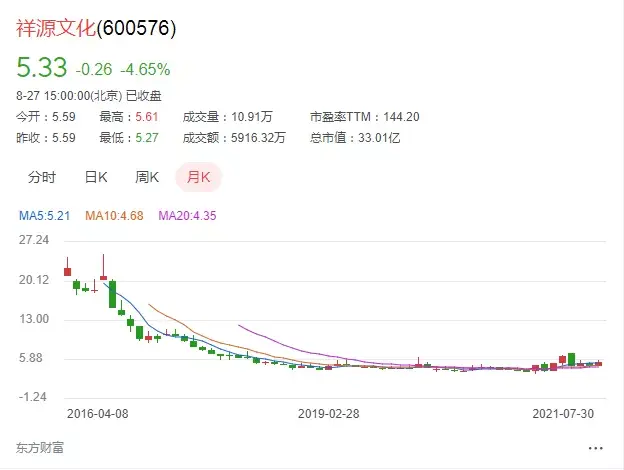 祥源文化,也就是之前的万家文化,股价从最高的27元附近,开始跌跌不休,如今,已经腰斩之后再腰斩,离最高点的零头都不剩,元气大伤,投资者损失惨重。
