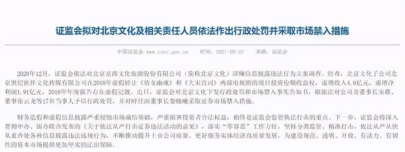 27日盘后,证监会公告称,拟对北京文化及相关责任人员依法作出行政处罚并采取市场禁入措施。