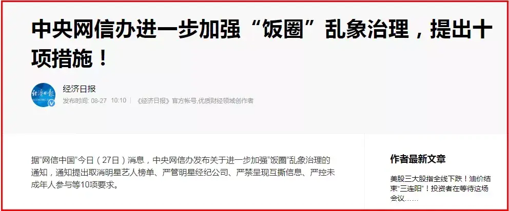 据报道,中央网信办日前发布的关于进一步加强“饭圈”乱象治理的通知提出取消明星艺人榜单、严管明星经纪公司、严禁呈现互撕信息、严控未成年人参与等10项要求。