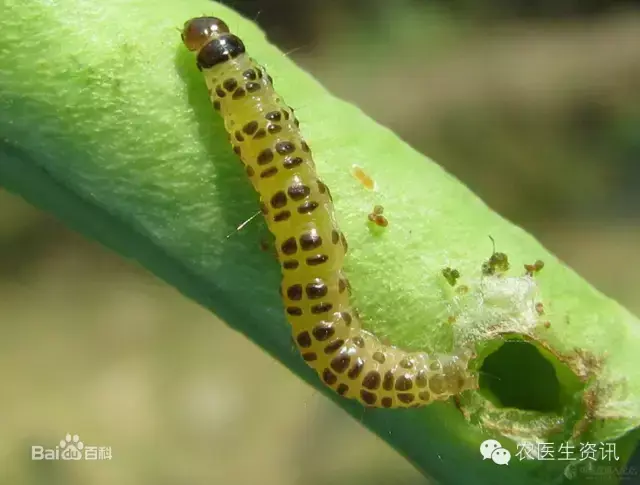 菜青虫是菜粉蝶的幼虫,体色青绿色,背面密布黑色小毛瘤。背线微带黄色,沿气门线有1黄斑,各体节多横列皱纹。